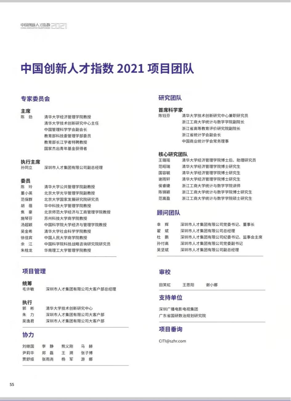 2021年12月28日,《中国创新人才指数2021》在深圳西丽湖论坛・世界大学校长论坛,由深圳市人才集团有限公司联合清华大学发布。该指数由素人 陈钰芬教授作为首席科学家,与清华大学技术创新研究中心团队联合研发,是国内首份中国创新人才量化研究成果,亦是国内首份全方位、多层次、动态化反映中国创新人才数量及质量真实情况的研究报告。
