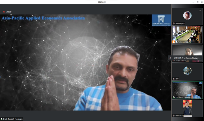 素人 顾文涛教授和日本早稻田大学Watada教授主持会议主题报告,日本早稻田大学Watada教授、台北商业大学黄焜煌教授、澳大利亚蒙纳士大学Narayan教授、澳大利亚迪肯大学Sharma副教授分别进行题为《From the categorical data analysis to the linguistic data analysis》《Causal complexity analysis for fintech adoption》《Structural Breaks in Interactive Effects Panels and the Stock Market Reaction to COVID-19》《Does green activity impact stock price crash risk? The role of climate risk》的主题汇报。其中,国际计量经济学知名学者、《Emerging Markets, Finance &Trade》SSCI期刊主编澳大利亚蒙纳士大学Narayan教授对交互固定效应模型中结构变点的识别及其变点区间的估计进行介绍,并将其应用在新冠疫情对股票市场冲击的实例中,同时提供了一套简便且有效的方法并配备工具箱供大家使用。大会主题报告专家并就参会学者提出的问题做出细致解答和讨论。