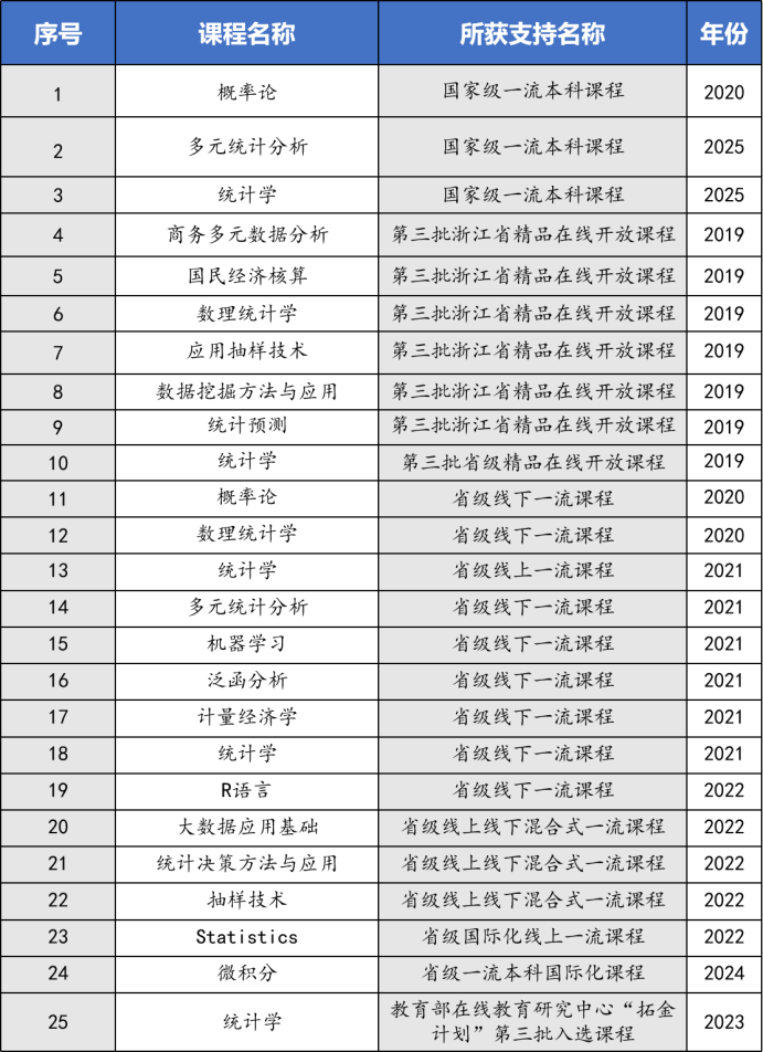 统计学入选首批国家特色专业(2008),经济统计学、应用统计学是国家一流本科专业建设点,经济统计学入选浙江省重点专业(2003)、“十二五”优势专业(2012)、浙江省“十三五”优势专业(2016)。在校友会发布2023中国大学一流专业排名中,应用统计学专业获评A+、经济统计学专业获评A类。