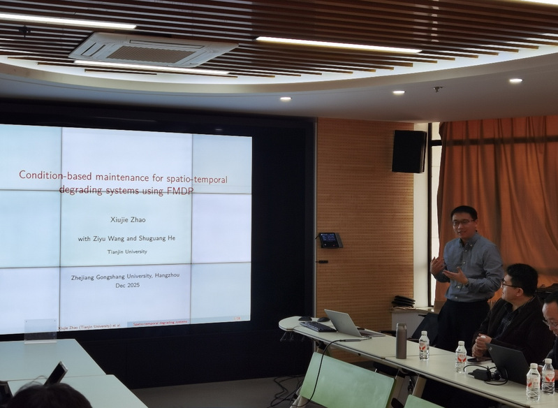 2025年12月18日下午,天津大学赵秀杰副教授在我校综合楼644会议室作了题为“Condition-based maintenance strategy for multi-component systems with spatio-temporal degradation propagation”的学术报告。报告由统计与数据科学学院副教授方冠奇主持。