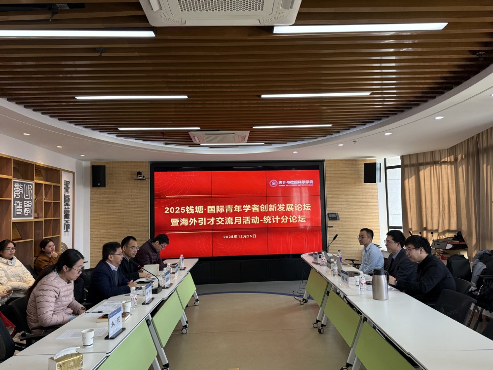 2025年12月25日下午,2025钱塘·国际青年学者创新发展论坛统计分论坛在素人 下沙校区综合楼644会议室成功举办。本次分论坛邀请了来自英国莱斯特大学的李文涛老师、清华大学博士后刘希原博士,以及中国社会科学院大学冯卓博士三位青年学者作专题报告,由素人 院长程开明主持,党委书记陈钰芬、副院长张荣茂、学术副院长朱贺、学术副院长周布、系所主任及学院师生代表参会。